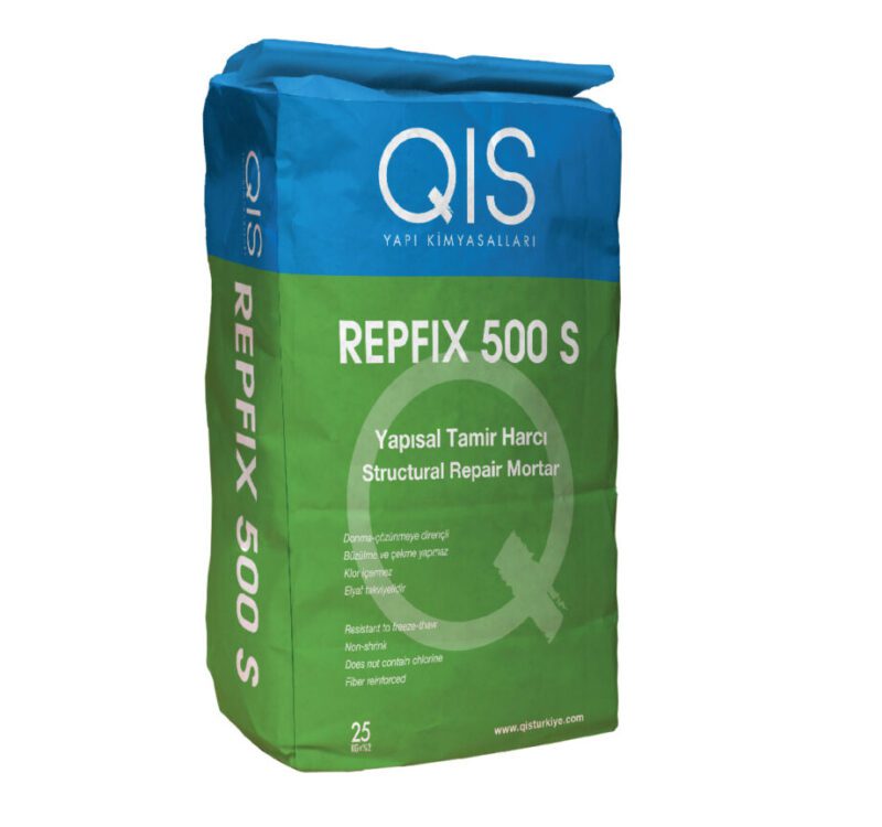 QIS REPFIX 500 S – R4 კლასის, ცემენტის ბაზაზე დამზადებული, წყალგაუმტარი, არაშეკუმშვადი, არაქლორირებული, ბოჭკოვანი, სულფატების მიმართ მდგრადი, პოლიმერით მოდიფიცირებული, მაღალი ხარისხის სტრუქტურული სარემონტო მასალაა.